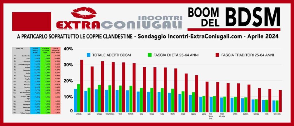 1) Lombardia: adepti al BDSM pari al 14,80% rispetto alla popolazione nazionale, salendo tale percentuale al 17,80% nella fascia di età compresa tra i 24 ed i 64 anni e salendo ulteriormente in questa fascia al 33,13% nella categoria dei traditori;
