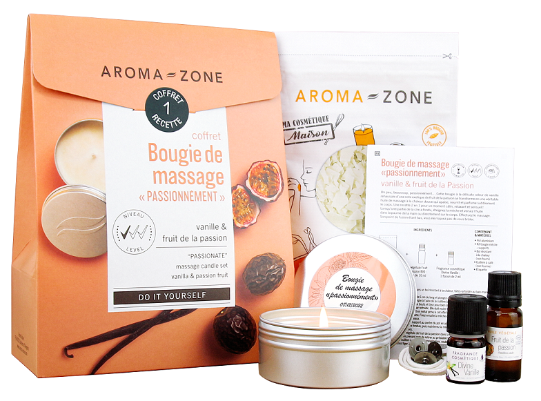 Il Kit cosmetico Aroma-Zone contiene tutti gli ingredienti e gli accessori necessari per realizzare una candela ideale per massaggi. Dal delicato profumo di vaniglia arricchito da una nota esotica del frutto della passione, questa candela si trasforma in un vero olio da massaggio dal calore delicato che lenisce, nutre e profuma delicatamente il corpo. Una ricetta 2 in 1 per un momento di coccola, rilassante e sensuale! Una box regalo per iniziare con i cosmetici fatti in casa in tutta semplicità… da regalarsi o da regalare.